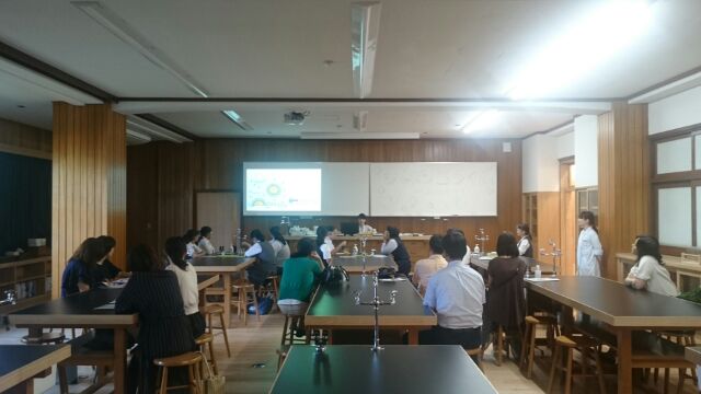 その後、ご希望の授業を2コマ体験していただきました。中学の社会の授業では、タブレットを使って「方言」調べをして日本地図の勉強をしました。また、英語の授業では毎日することを英語で言ってみる練習をしました。高校では理科の授業で汚れが落ちるメカニズムを紹介した後、石けん作りを行いました。フードの授業では熱中症予防の手作りスポーツドリンクに挑戦しました。英語の授業では、英語版「となりのトトロ」を見ながら、日本語版との表現の違いに驚いた人もたくさんいたことと思います。その他、国語や数学、ICTの授業にも参加していただきました。